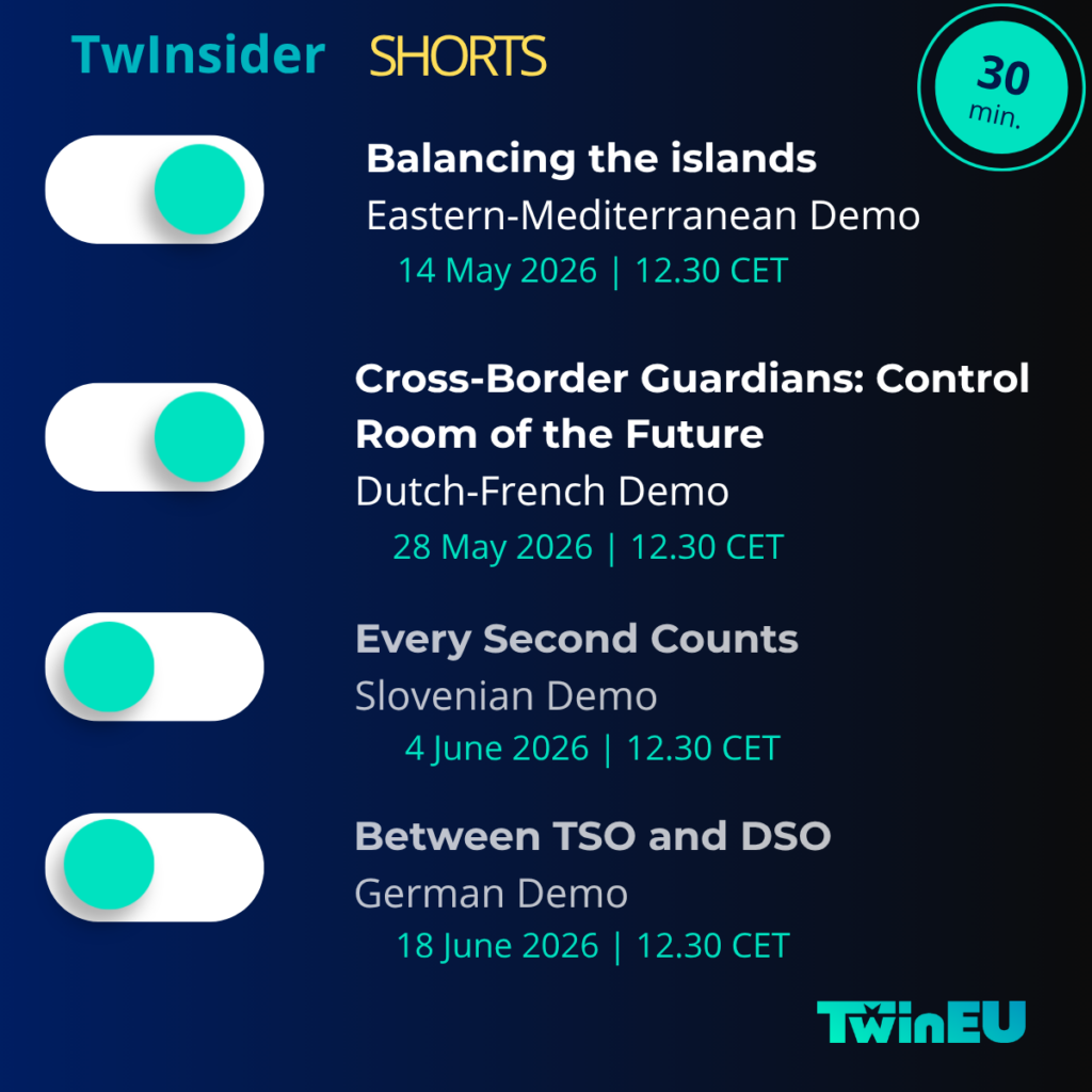 The series reflects the ambition of TwinEU’s demo areas across Europe, developing digital twins to enhance the security of supply all over the European power system. The topics will cover a wide range of digital twin solutions from scenario building and advanced forecasting, virtual line rating sensors, cross-border market optimization to TSO-DSO coordination and flexibility facilitation, substation design validation and cyber-threat detection.
